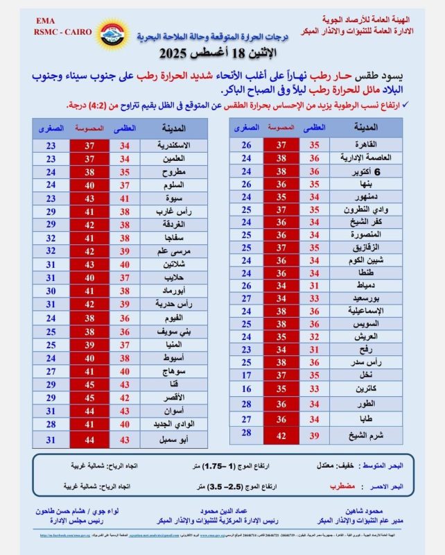 أعلنت الهيئة العامة للأرصاد الجوية، أن طقس اليوم الاثنين ، يشهد أجواء شديدة الحرارة رطبة على أغلب الأنحاء نهارًا، ومائل للحرارة رطب ليلًا وفي الصباح الباكر على شمال البلاد حتى القاهرة الكبرى، بينما يكون شديد الحرارة على جنوب سيناء وجنوب البلاد.