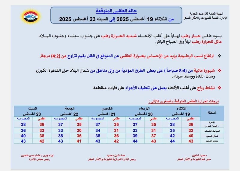 أعلنت الهيئة العامة للأرصاد الجوية، أن طقس اليوم الاثنين ، يشهد أجواء شديدة الحرارة رطبة على أغلب الأنحاء نهارًا، ومائل للحرارة رطب ليلًا وفي الصباح الباكر على شمال البلاد حتى القاهرة الكبرى، بينما يكون شديد الحرارة على جنوب سيناء وجنوب البلاد.
