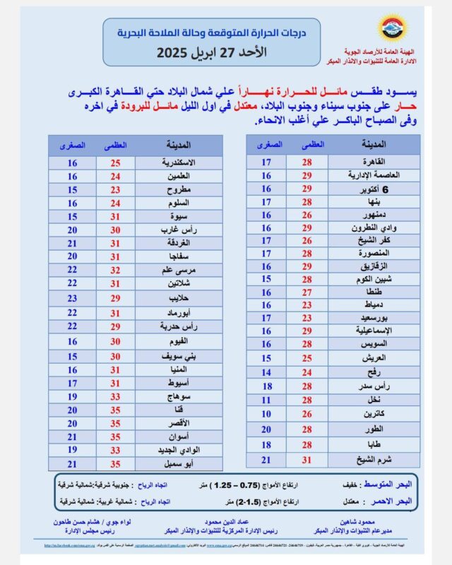 وفيما يلي بيان بدرجات الحرارة المتوقعة اليوم على محافظات ومدن مصر :-