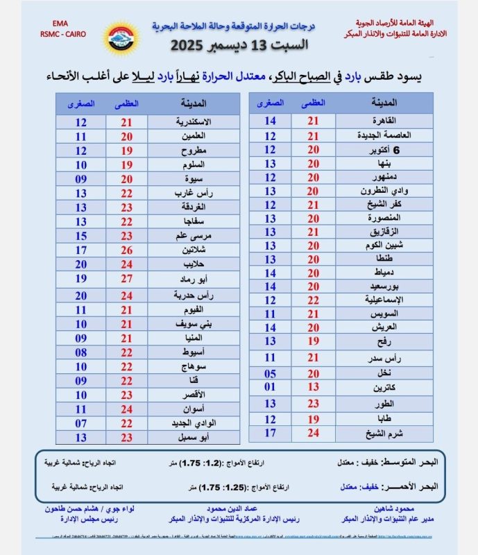 يتوقع خبراء هيئة الأرصاد الجوية أن يسود البلاد، اليوم السبت، طقس بارد صباحا، معتدل الحرارة على أغلب أنحاء الجمهورية، نهارا، بارد ليلا.
