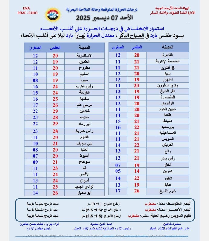 وفيما يلي بيان بدرجات الحرارة المتوقعة اليوم على محافظات ومدن مصر: