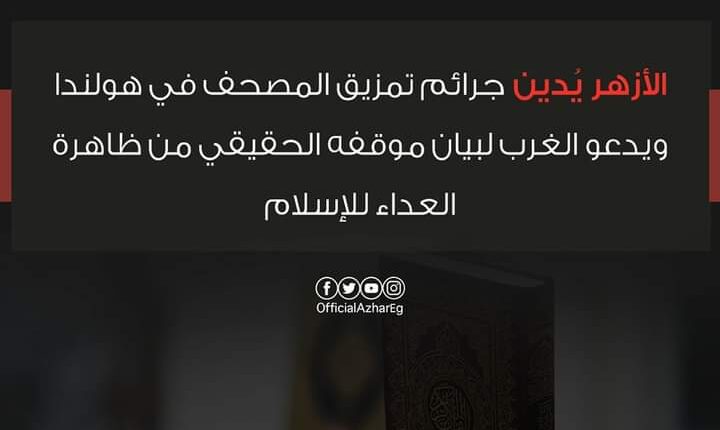 يُعربُ الأزهر الشريف عن إدانته الشديدة واستيائه البالغ تجاه جرائم تمزيق نسخٍ من المصحف الشريف أمام عددٍ من السفارات في لاهاي بهولندا، في سلسلةٍ متواصلةٍ من الجرائم المرتكبة بحقِّ الإسلام ومقدساته، مشددًا على أنَّ ارتكاب هذه الجرائم ومجيئها هذه الأيام بالتزامن مع مناسبة ذكرى مولد نبي الإسلام والسلام والرحمة والإنسانية ﷺ لهو دليلٌ على تعمد زيادة وتيرة الإسلاموفوبيا ورفع العداء للإسلام والمسلمين.