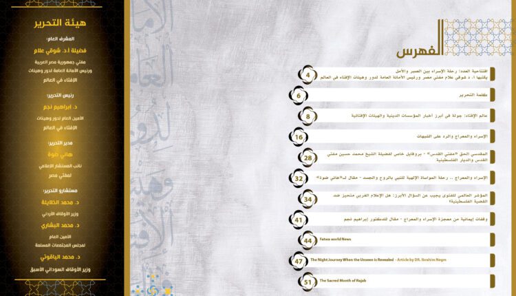 ويكتب افتتاحية العدد فضيلة الأستاذ الدكتور شوقي علام -مفتي جمهورية مصر العربية، رئيس الأمانة العامة لدُور وهيئات الإفتاء في العالم- وذلك بعنوان “رحلة الإسراء بين الصبر والأمل” يتحدث فيها عن رحلة الإسراء والمعراج وما سبقها من أحداث كانت سببًا فيها لتكون رحلة نستلهم منها قيمًا مهمة مثل الثقة بنصر الله وحسن التسليم والتوكل عليه والأخذ بالأسباب.