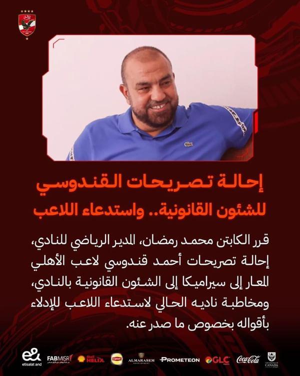تم توجيه الشؤون القانونية بالتحقيق في التصريحات وتقديم تقرير مفصل للإدارة. كما تم استدعاء قندوسي للحضور إلى النادي وتقديم توضيحات حول ما صدر عنه من تصريحات، والتي يبدو أنها لم تلقَ قبولًا داخل إدارة النادي الأهلي.