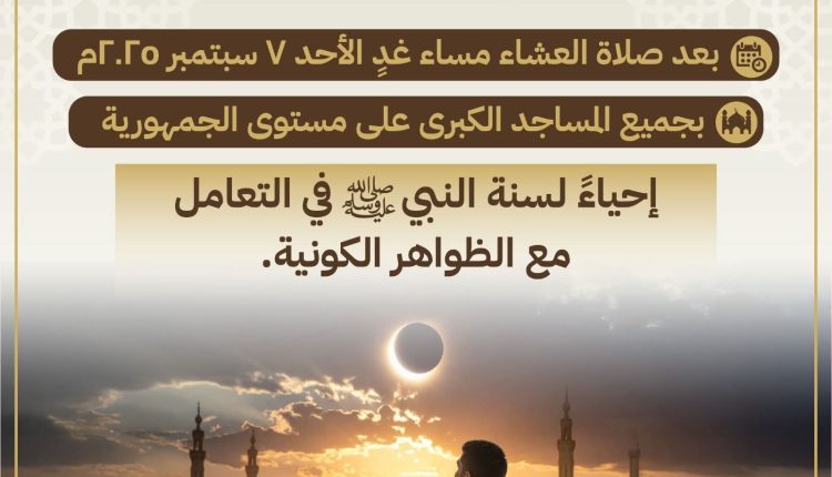 تبث الصفحة الرسمية لوزارة الأوقاف على مدار يوم غدٍ الأحد 7 سبتمبر 2025م مجموعة من البنرات والفيديوهات التوضيحية التي تقدم للمواطنين معلومات عن ظاهرة خسوف القمر، وتستعرض الحكم الشرعي وآداب التعامل مع هذه الظواهر الكونية وفق سنة النبي ﷺ، على أن تُقام صلاة الخسوف مساء غدٍ الأحد بجميع المساجد الكبرى على مستوى الجمهورية.