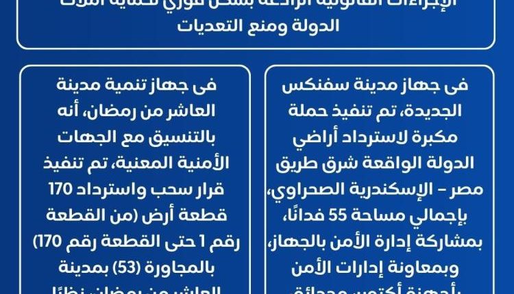 وفي هذا الإطار، أوضح جهاز مدينة سفنكس الجديدة، أنه تم تنفيذ حملة مكبرة لاسترداد أراضي الدولة الواقعة شرق طريق مصر – الإسكندرية الصحراوي، بإجمالي مساحة 55 فدانًا، بمشاركة إدارة الأمن بالجهاز، وبمعاونة إدارات الأمن بأجهزة أكتوبر، وحدائق أكتوبر، وأكتوبر الجديدة، وزايد، وذلك تحت تأمين من شرطة التعمير بمدينة سفنكس الجديدة .