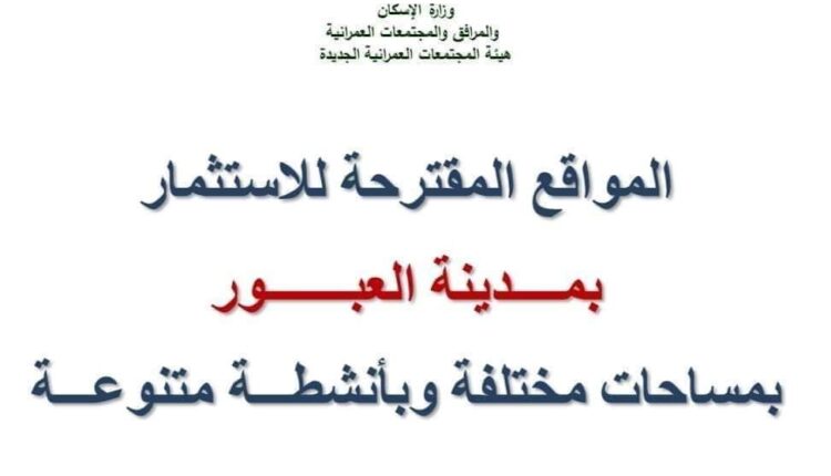 أعلن المهندس أحمد رشاد، رئيس جهاز تنمية مدينة العبور، عن طرح قطع أراض بنظام التخصيص الفورى لشهر أغسطس ٢٠٢٤ عن طريق التقديم بالموقع الإلكتروني لهيئة المجتمعات العمرانية الجديدة، واستكمال باقي الإجراءات بمقر الهيئة بالعاصمة الادارية وذلك حتى يوم ٢٠٢٤/٨/١٥.