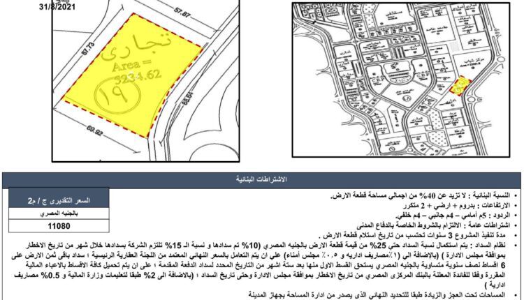 وأوضح رئيس جهاز مدينة الشروق، أنه فيما يتعلق بنظام التخصيص الفوري، تم إتاحة قطعة أرض بالحى الثالث بنشاط تعليمى لإقامة مدرسة بمساحة 5389 م2، بنسبة بنائية لا تتعدى 30% من مساحة قطعة الأرض، وبارتفاع بدروم وأرضى و 3  أدوار متكررة مع الالتزام باشتراطات هيئة الأبنية التعليمية، مضيفاً أنه تم إتاحة قطعة أرض بمركز خدمات المدينة 2 بمساحة 5234م2، وقطعة أرض بمساحة 1224 م2 بمنطقة الإسكان العائلى لإقامة أنشطة تجارية بنسبة بنائية لا تزيد عن 40% من المساحة الإجمالية بارتفاع بدروم ودور أرضى ودور أول فقط، مع الالتزام باشتراطات الدفاع المدني.