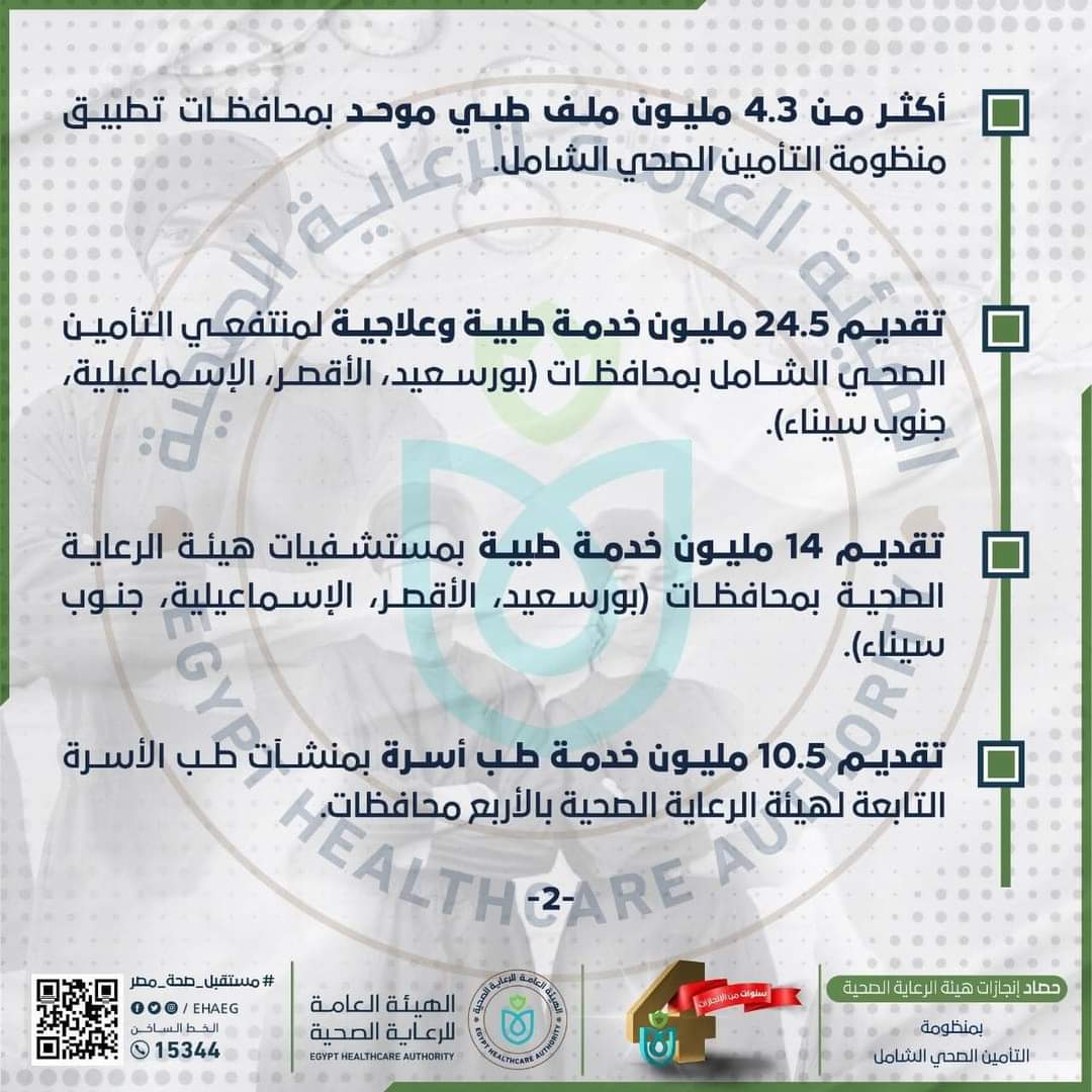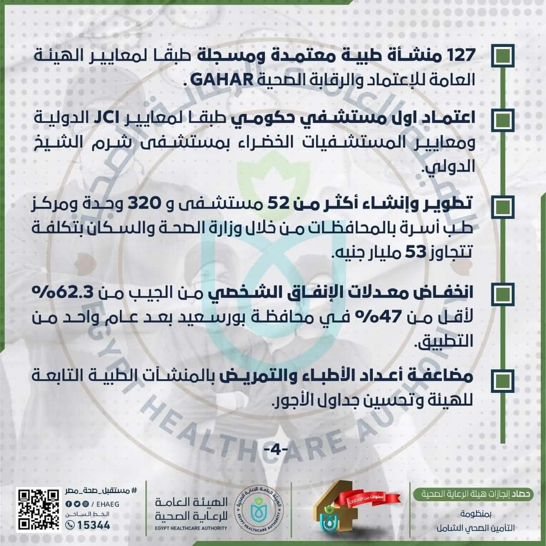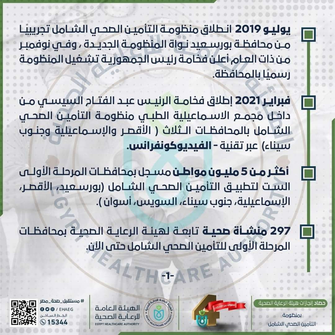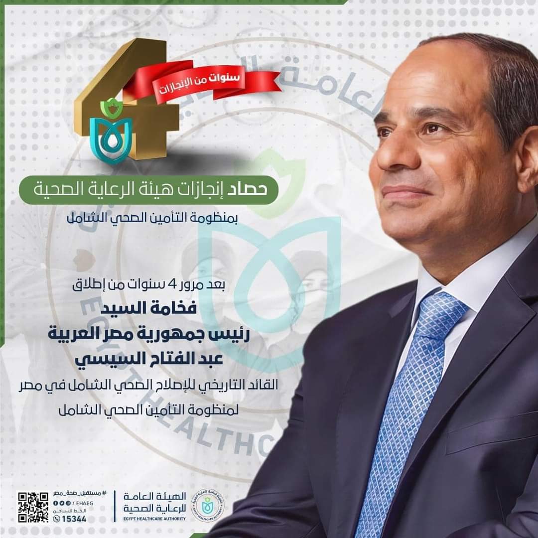 بعد مرور 4 سنوات من إطلاق فخامةالرئيس عبد الفتاح السيسي رئيس الجمهورية القائد التاريخي للإصلاح الصحي الشامل في مصر، لمنظومة التأمين الصحي الشامل الجديدة، وذلك من محافظة بورسعيد في يوليو 2019 ، معلنًا تشغيل المنظومة رسميًا في نوفمبر من ذات العام.