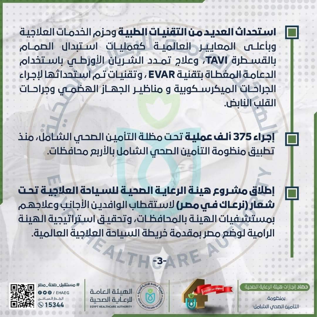 ، تم إجراء 375 ألف عملية بمستشفيات هيئة الرعاية الصحية بالأربع المحافظات، وذلك تحت مظلة التأمين الصحي الشامل، مشيرًا إلى استحداث العديد من التقنيات الطبية وحزم الخدمات العلاجية وبأعلى المعايير العالمية كعمليات استبدال الصمام بالقسطرة TAVI، وعلاج تمدد الشريان الأورطي باستخدام الدعامة المغطاة بتقنية EVAR ، وتقنيات تم استحداثها لإجراء الجراحات الميكرسكوبية و مناظير الجهاز الهضمي وجراحات القلب النابض.. إلخ