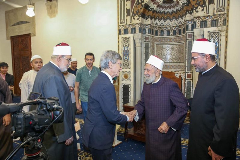 واصطحب فضيلة الدكتور محمد الضويني، وكيل الأزهر، البروفيسور الأمريكي في جولة تفقدية داخل الجامع الأزهر؛ تعرّف خلالها على النشاط الفكري والعلمي بالجامع، إلى جانب الأنشطة العلمية للرواق الأزهري، كما شاهد حلقات تحفيظ القرآن الكريم ودروس العلوم الشرعية والعربية، واستمع إلى شرح تفصيلي حول هذه الأنشطة ودورها في ترسيخ قيم الوسطية والاعتدال وتصحيح المفاهيم الخاطئة لدى رواد الجامع الأزهر الشريف، الذين يفدون إليه من مختلف دول العالم، مما يجعله منبرًا عالميًا لنشر ثقافة الاعتدال والوسطية.