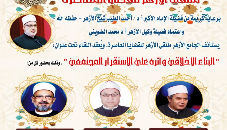 يواصل ملتقى “الأزهر للقضايا المعاصرة” بالجامع الأزهر الشريف، فعالياته الأسبوعية غدًا الثلاثاء ، تحت عنوان: ” البناء الأخلاقي وأثره على الاستقرار المجتمعي”، وذلك تحت رعاية فضيلة الإمام الأكبر الدكتور أحمد الطيب شيخ الأزهر الشريف، وبتوجيهات من الدكتور محمد الضويني وكيل الأزهر، وإشراف الدكتور عبد المنعم فؤاد، المشرف العام على الرواق الأزهري، والدكتور هاني عودة، مدير عام الجامع الأزهر.