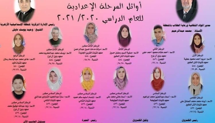 وحصل علي المركز الاول مريم احمد عطية معهد فتيات التل الكبير بمجموع ٤٨٨المركز التاني احمد هشام حجي معهد ال نوح المجموع ٤٨٦ المركز الثالث صفية السيد رمضان معهد التل الكبير المجموع ٤٨٤المركز التالق مكرر مرفت مدحت حسين عبد الرحمن معهد القرين مجموع ٤٨٤المركز الثالث مكرر يوسف محمد عبد الكريم معهد ال نوح مجموع ٤٨٤ المركز الرابع هاجر محمد عبد الباسط رسلان معهد فايد مجموع ٤٨٠المركز الخامس لينة محمد الصادق معهد التل الكبير مجموع ٤٧٧المركز السادس اسماء عبد العزيز ابراهيم معهد العوايضة مجموع ٤٧٦السادس مكرر اسماء هاني محمد معهد فتيات العوايضة مجموع ٤٧٦السادس مكرر ابتسام اسليم سالم معهد فتيات الشامي مجموع ٤٧٦السادس مكرر ساره عبد الحميد الشبراوي معهد فتيات الشامي مجموع ٤٧٦ السادس مكرر زياد عبد الله توفيق معهد ال نوح ٤٧٦