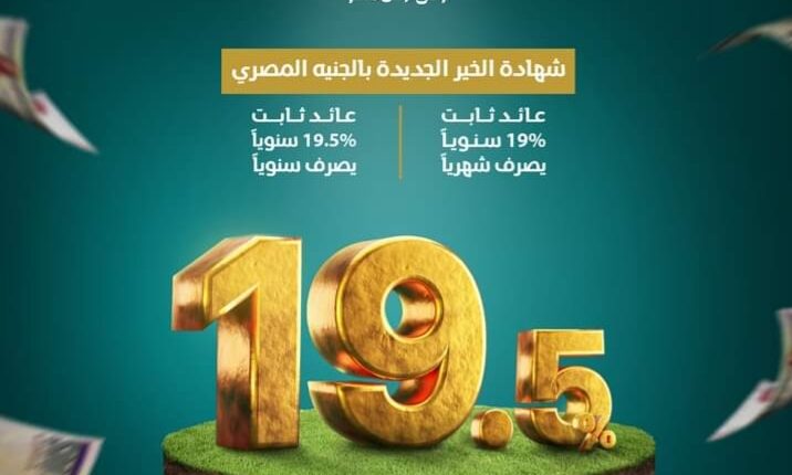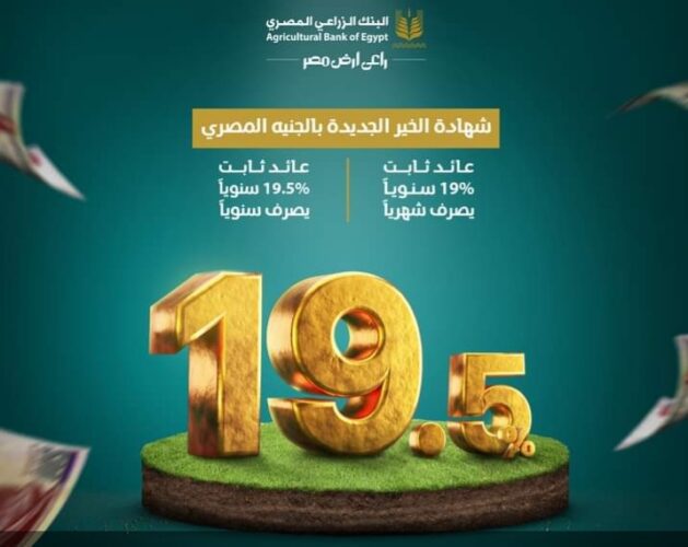 أصدر البنك الزراعي المصري شهادة الخير الجديدة بالجنيه المصري لمدة ثلاثة أعوام، بعائد 19في المائة يصرف شهريا’ وبعائد 19.5 في المائة يصرف سنويًا .