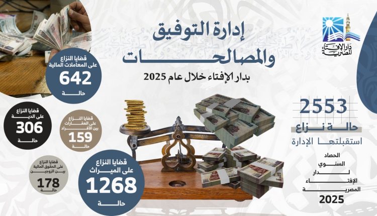 حققت إدارة التوفيق والمصالحات بدار الإفتاء المصرية خلال عام 2025 نشاطًا ملحوظًا في معالجة العديد من قضايا النزاعات الأسرية والمجتمعية، حيث استقبلت الإدارة 2553 حالة نزاع خلال العام 2025، وذلك اضطلاعًا بدورها في دعم الاستقرار المجتمعي ونشر ثقافة الصلح والسلم الاجتماعي.