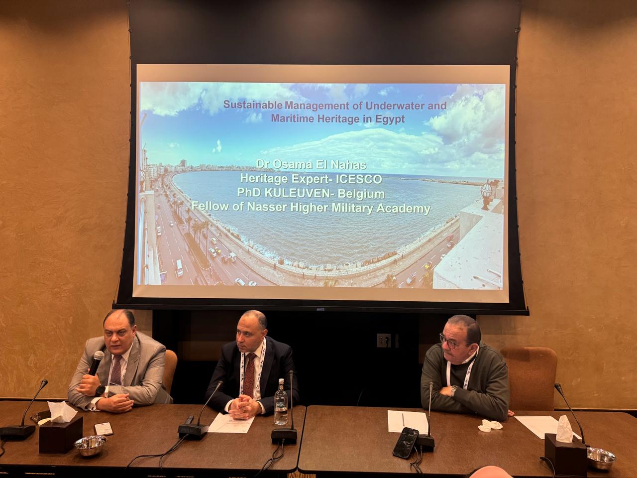 حيث استعرض د. أسامة النحاس تقييم الوضع الحالى لحماية وإدارة التراث الثقافى المغمور فى مصر، وتحديد التحديات الرئيسية التى تواجه هذا المجال، كما تناول د. سامح رياض دور الدولة المصرية والمشاريع التي أقامتها لوقف الصرف الصحي والسيطرة على مصادر الصرف الصناعي المنشآت الصناعية على المنطقة ووقف التلوث البحري، مؤكدا على دور تلك المشاريع فى تحسين نوعية مياه البحر وزيادة الشفافية لمياه البحر للقدرة على إنشاء متاحف تحت المياه ورؤية الآثار الغارقة الموجودة، لوضع الإسكندرية على المسار والخريطة العالمية للسياحة