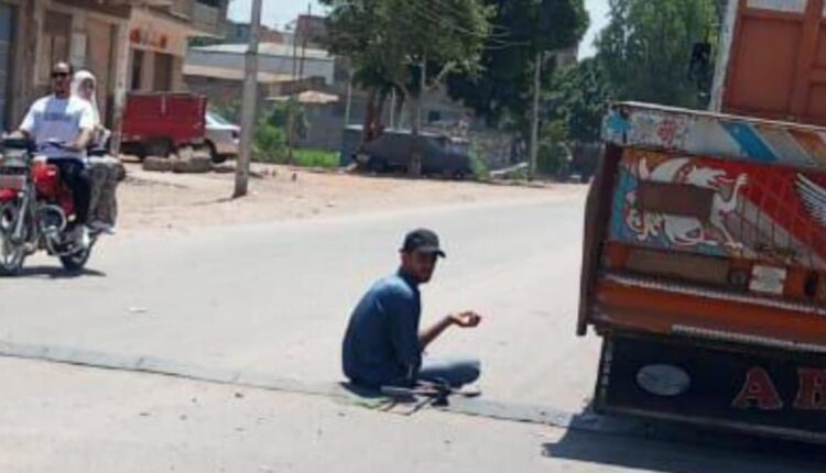 وفي طريق طنطا السنطه وبمنطقة عزبة السبيل يجلس شاب في وسط الاسفلت ويمد يده للسيارات التي تسير بسرعه ومعرض حياته للموت أسفل عجل السيارات