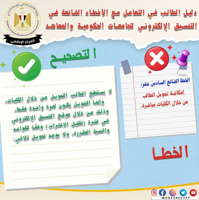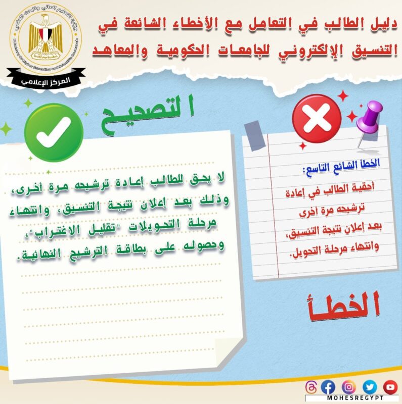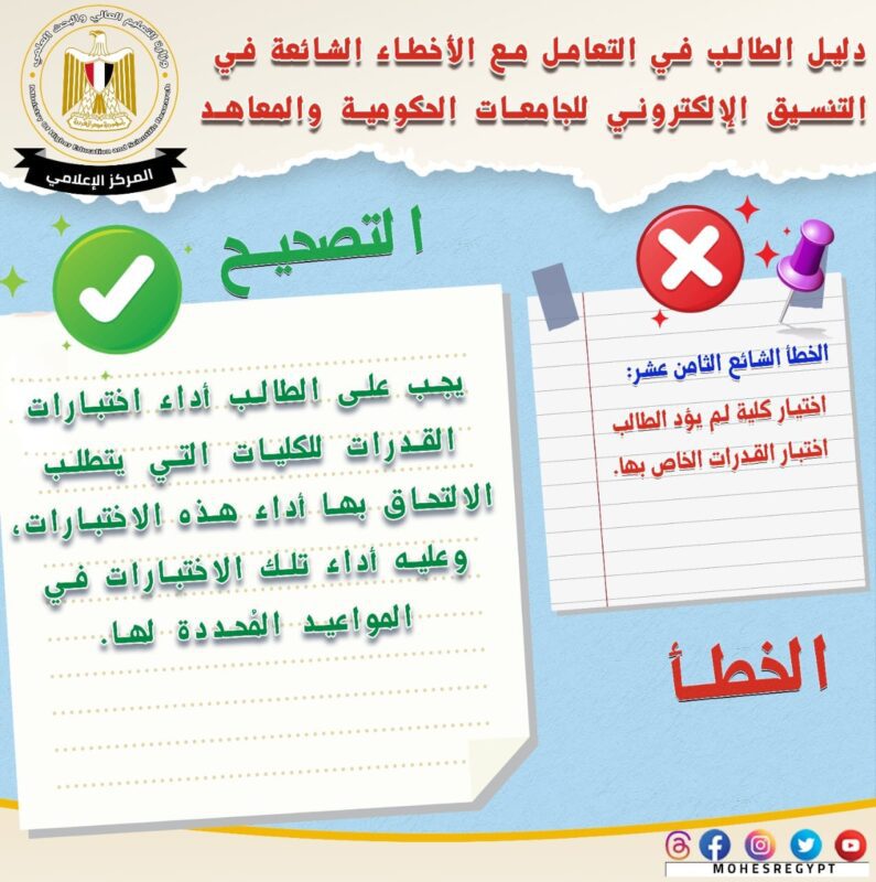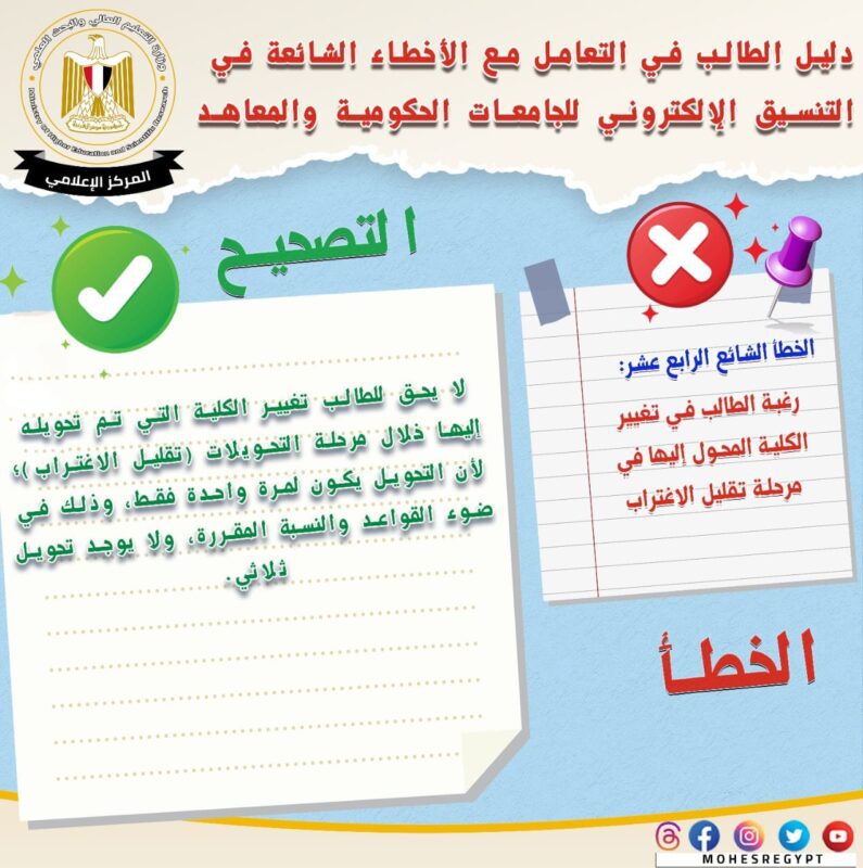 وأضاف أن الدليل الحالي يتضمن أبرز الأخطاء الشائعة التي يقع طلاب الثانوية العامة فيها، وكيفية التعامل الصحيح مع هذه الأخطاء حتى يتجنب الطلاب الوقوع فيها، خلال فترة التنسيق للالتحاق بالجامعات الحكومية والمعاهد.