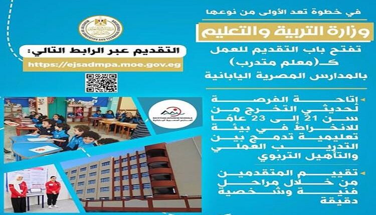 في خطوة تعد الأولى من نوعها ضمن جهود وزارة التربية والتعليم والتعليم الفني لتطوير المنظومة التعليمية وبناء قدرات المعلمين الشباب، تعلن وحدة المدارس المصرية اليابانية عن فتح باب التقديم للعمل كـ”معلم متدرب” داخل المدارس المصرية اليابانية، وذلك لمدة لا تقل عن عام دراسي وحتى عامين.
