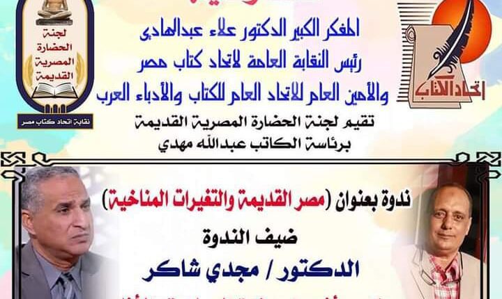 تنظم لجنة الحضارة المصرية القديمة بالنقابة العامة لاتحاد كتاب مصر .. ندوة بعنوان «مصر القديمة والتغيرات المناخية» .. وذلك تماشيا مع رؤية مصر ٢٠٣٠ لمواجهة الآثار المترتبة على التغيرات المناخية .. من خلال وجود نظام بيئي متكامل.