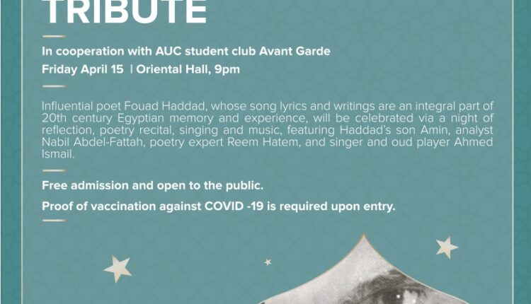 ينظم مركز التحرير الثقافي بالجامعة الأمريكية بالقاهرة حفل تكريم للشاعر المصري فؤاد حداد الذي تعد كلمات أغانيه وكتاباته جزءًا لا يتجزأ من الذاكرة الموسيقية المصرية وذلك في أمسية شعرية وموسيقىة. ستبدأ الفعالية بحلقة نقاش عن دور شعر حداد في المجتمع والذاكرة المصرية بحضور كلٍ من أمين حداد، نجل فؤاد حداد ونبيل عبد الفتاح كاتب ومحلل سياسي. تدير المناقشة الشاعرة ريم حاتم. سيعقب المناقشة عرض موسيقي لأحمد إسماعيل المطرب وعازف العود الذي سيغني نخبة من أشهر أغاني حداد.