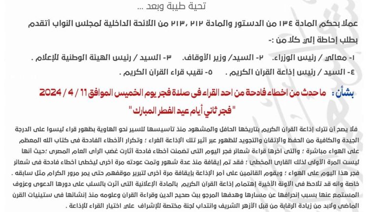 وتابع عضو مجلس النواب فى إحاطته: لا يصح أن نترك إذاعة القرآن الكريم بتاريخها الحافل والمشهود منذ تأسيسها للسير نحو الهاوية بظهور قراء ليسوا على الدرجة الجيدة والكافية من الحفظ والإتقان والتجويد للظهور عبر أثير تلك الإذاعة الغراء؛ وتكرار الأخطاء الفادحة فى كتاب الله المعظم على الهواء؛ والتى آخرها قراءة شعائر فجر اليوم التى تضمنت أخطاء فادحة أثارت غضب الرأى العام المصرى؛حيث أنها ليست المرة الأولى لتلك القارئ المخطئ؛ فقد تم إيقافة منذ عدة شهور وتمت عودته مرة أخرى ليخطئ أخطاء فادحة فى شعائر فجر هذا اليوم على الهواء؛ ويقوم القائمين على أمر الإذاعة بإيقافة مرة أخرى لتبرير موقفهم حتى يمر مرور الكرام مثل سابقه.
