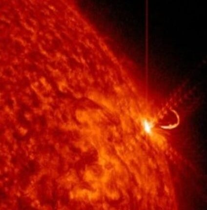 وأن التوهج الشمسي هو انفجار في الشمس يحدث عندما يتم إطلاق الطاقة المخزنة في الحقول المغناطيسية المتشابكة (عادة فوق البقع الشمسية) فجأة، حيث تنتج التوهجات دفعة من الإشعاع عبر الطيف الكهرومغناطيسي ، من موجات الراديو إلى الأشعة السينية وأشعة جاما.