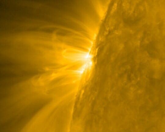 وقالت أن هذه الصورة التقطت عبر الضوء الغير مرئي – بواسطة مرصد ديناميكا الشمس التابع لوكالة ناسا – حيث تظهر الحلقات الاكليلية وهي عبارة عن أقواس تمتد من الشمس حيث البلازما تتحرك على طول خطوط المجال المغناطيسي والنقاط اللامعة هي مواقع حيث المجال المغناطيسي بالقرب من السطح بشكل قوي.
