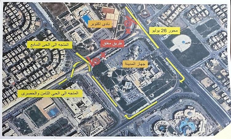 وأوضحت محافظة الجيزة أن الإدارة العامة لمرور الجيزة قامت بإجراء التحويلة المرورية التالية: ـ حركة المركبات القادمة من طريق امتداد محور ٢٦ يوليو والراغبة في السير باتجاه المحور المركزي الموازي تستكمل السير بطريق امتداد محور ٢٦ يوليو ثم الدخول يمينًا إلى طريق المحور المركزي ثم الدخول يمينًا إلى الشارع الخلفي لجهاز تنمية مدينة ٦ أكتوبر وصولًا إلى المحور المركزي الموازي ومناطق الحي السابع والثامن وذلك عقب تجاوز منطقة الأعمال.