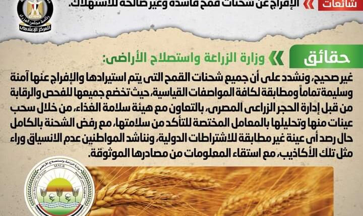 تداولت بعض المواقع الإلكترونية وصفحات التواصل الاجتماعي أنباء تزعم الإفراج عن شحنات قمح فاسدة وغير صالحة للاستهلاك، وقد قام المركز الإعلامي لمجلس الوزراء بالتواصل مع وزارة الزراعة واستصلاح الأراضي، والتي نفت تلك الأنباء، مُؤكدةً أنه لا صحة للإفراج عن شحنات قمح فاسدة أو غير صالحة للاستهلاك، مُشددةً على أن جميع شحنات القمح التي يتم استيرادها والإفراج عنها آمنة وسليمة تماماً ومطابقة لكافة المواصفات القياسية، حيث تخضع جميعها للفحص والرقابة من قبل إدارة الحجر الزراعي المصري، بالتعاون مع هيئة سلامة الغذاء، من خلال سحب عينات منها وتحليلها بالمعامل المختصة للتأكد من سلامتها، مع رفض الشحنة بالكامل حال رصد أي عينة غير مطابقة للاشتراطات الدولية، مُناشدةً المواطنين عدم الانسياق وراء مثل تلك الأكاذيب، مع استقاء المعلومات من مصادرها الموثوقة.
