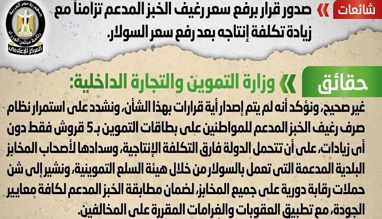 نفي المركز الإعلامي لمجلس الوزراء ما انتشر في بعض المواقع الإلكترونية وصفحات التواصل الاجتماعي بشأن صدور قرار برفع سعر رغيف الخبز المدعم تزامناً مع زيادة تكلفة إنتاجه بعد رفع سعر السولار.