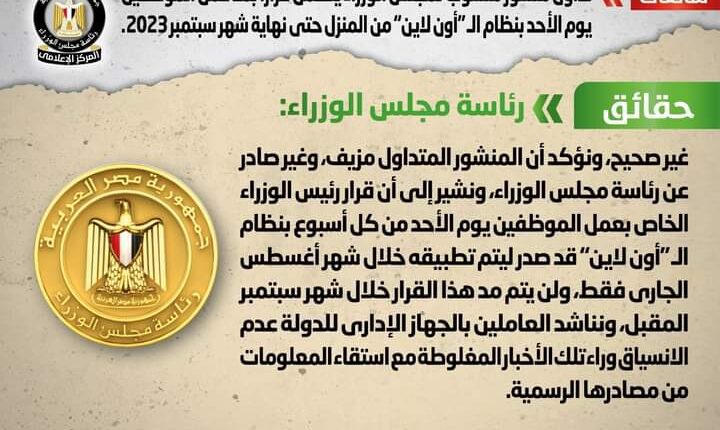 تداولت بعض المواقع الإلكترونية وصفحات التواصل الاجتماعي منشوراً منسوباً لمجلس الوزراء يتضمن قراراً بمد عمل الموظفين يوم الأحد بنظام الـ “أون لاين” من المنزل حتى نهاية شهر سبتمبر 2023، وقد تم نفي تلك الأنباء تماماً، وأكد مجلس الوزراء أنه لا صحة لمد عمل الموظفين يوم الأحد بنظام الـ “أون لاين” من المنزل حتى نهاية شهر سبتمبر 2023، وأن المنشور المتداول مزيف، وغير صادر عن رئاسة مجلس الوزراء، مُشيراً إلى أن قرار رئيس الوزراء الخاص بعمل الموظفين يوم الأحد من كل أسبوع بنظام الـ “أون لاين” قد صدر ليتم تطبيقه خلال شهر أغسطس الجاري فقط، ولن يتم مد هذا القرار خلال شهر سبتمبر المقبل، مناشداً العاملين بالجهاز الإداري للدولة عدم الانسياق وراء تلك الأخبار المغلوطة مع استقاء المعلومات من مصادرها الرسمية.