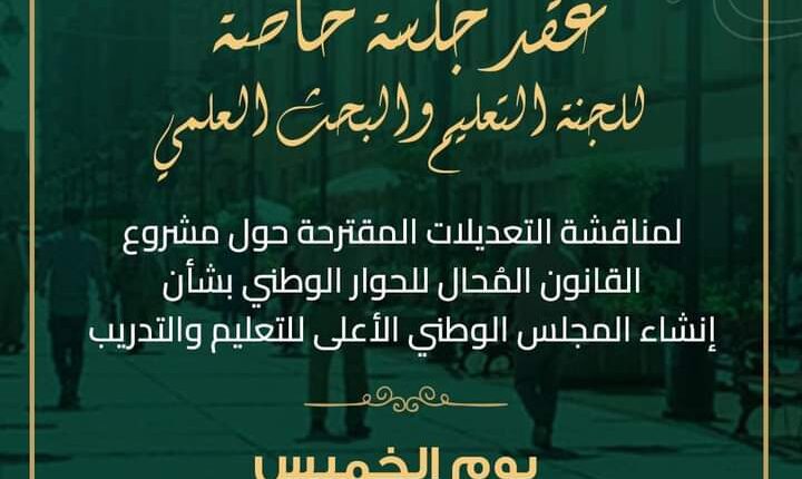 استجابةً لدعوة رئيس الجمهورية، قرر مجلس أمناء الحوار الوطني، عقد جلسة خاصة للجنة التعليم والبحث العلمي التابعة للمحور المجتمعي، يوم الخميس الموافق 3 اغسطس 2023، لاستكمال المناقشات حول التعديلات المقترحة لمشروع قانون إنشاء المجلس الوطني الأعلى للتعليم والتدريب والمُحال إلى الحوار الوطني من مجلس الوزراء بناءً على توجيه السيد رئيس الجمهورية.
