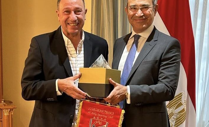 وقام الخطيب بإهداء درع وعلم النادي للسفير خالد جلال عبد الحميد، تقديرًا للجهود الكبيرة التي يقوم بها ومعه طاقم السفارة المصرية.