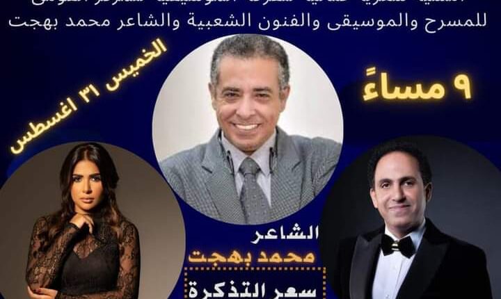 ينظم المركز القومي للمسرح والموسيقى والفنون الشعبية برئاسة الفنان ايهاب فهمي ، أمسية شعرية غنائية للشاعر محمد بهجت بمصاحبة فرقة المركز الموسيقية ، الساعة التاسعة مساء الخميس المقبل ٣١ أغسطس ٢٠٢٣م على مسرح ساحة مركز الهناجر للفنون.