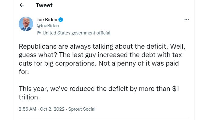 نشر جو بايدن الرئيس الأمريكي عبر منصة التواصل الاجتماعي “تويتر” تدوينة قال فيها أن الجمهوريين دائما يتحدثون عن العجز ، متسائلاً ماذا زاد الرجل الأخير بتخفيضات ضريبة للشركات الكبرى موضحاً أنه لم يتم دفع فلس واحد .