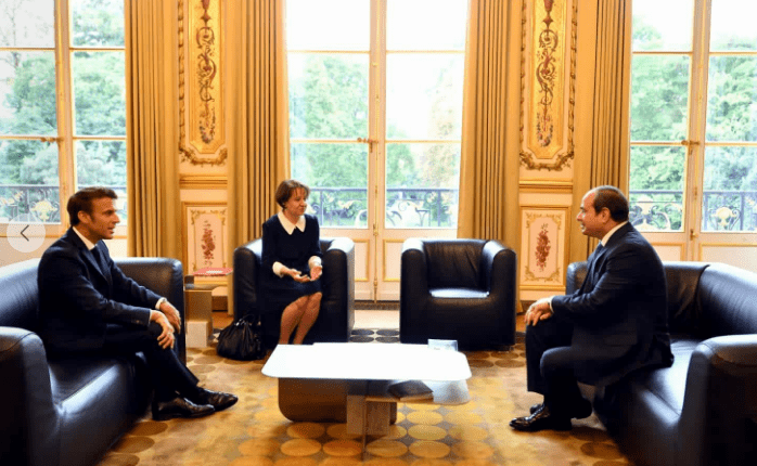 وصرح المتحدث الرسمي باسم رئاسة الجمهورية بأن اللقاء شهد إجراء مباحثات بين الرئيسين، حيث رحب في مستهلها الرئيس الفرنسي بزيارة السيد الرئيس إلى باريس؛ مؤكداً تقدير فرنسا لمصر على المستويين الرسمى والشعبى، واعتزازها بالروابط التاريخية التى تجمع بين البلدين الصديقين، والتزام بلاده بدعم مسيرة العلاقات الثنائية المشتركة في مختلف المجالات على نحو بناء وإيجابي، ومشيداً في هذا الصدد بجهود الرئيس لصون السلم والأمن الإقليميين.