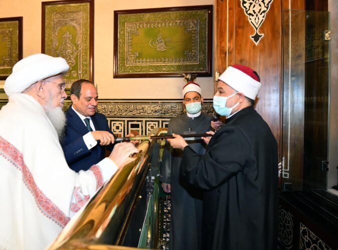 افتتح الرئيس عبد الفتاح السيسي صباح اليوم مسجد سيدنا الحسين بعد أعمال التجديد الشاملة للمسجد بما في ذلك المقصورة الجديدة للضريح الشريف للأمام الحسين، وشارك الرئيس في الافتتاح السلطان مفضل سيف الدين، سلطان طائفة البهرة بالهند يرافقه سمو الأمراء من اشقائه وأنجاله، منهم الأمير القائد جوهر عز الدين، والأمير جعفر الصادق سيف الدين، وكذلك مفضل محمد حسن ممثل السلطان بمصر”.