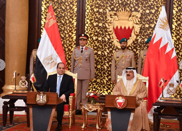 وصرح المتحدث الرسمي باسم رئاسة الجمهورية بأن جلالة الملك حمد بن عيسى رحب بأخيه السيد الرئيس ضيفاً عزيزاً على البحرين، معرباً عن اعتزاز الحكومة والشعب البحريني بما يجمعهما بمصر وشعبها من أواصر تاريخية وطيدة وعلاقات وثيقة في مختلف المجالات، ومؤكداً التقدير البالغ للدور الاستراتيجي والمحوري الذي تقوم به مصر تحت قيادة السيد الرئيس في حماية الأمن القومي العربي والدفاع عن قضايا الأمة العربية.