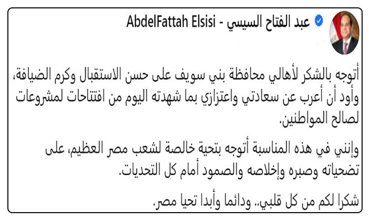 وكتب الرئيس السيسي تدوينة علي صفحته الرسمية بموقع التواصل الاجتماعي “فيس بوك” اليوم السبت “أتوجه بالشكر لأهالي محافظة بني سويف على حسن الاستقبال وكرم الضيافة، وأود أن أعرب عن سعادتي واعتزازي بما شهدته اليوم من افتتاحات لمشروعات لصالح المواطنين.”