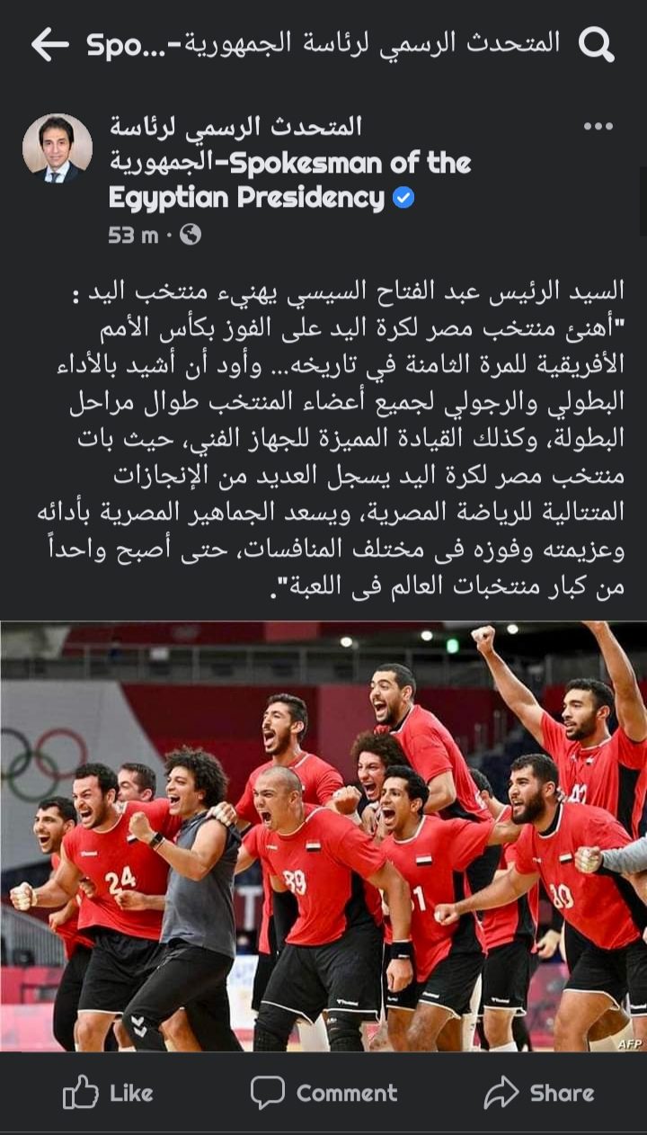 وجه الرئيس عبد الفتاح السيسي رسالة تهنئة إلى المنتخب المصري لكرة اليد بعد الفوز بأمم إفريقيا للمرة الثامنة في تاريخها.