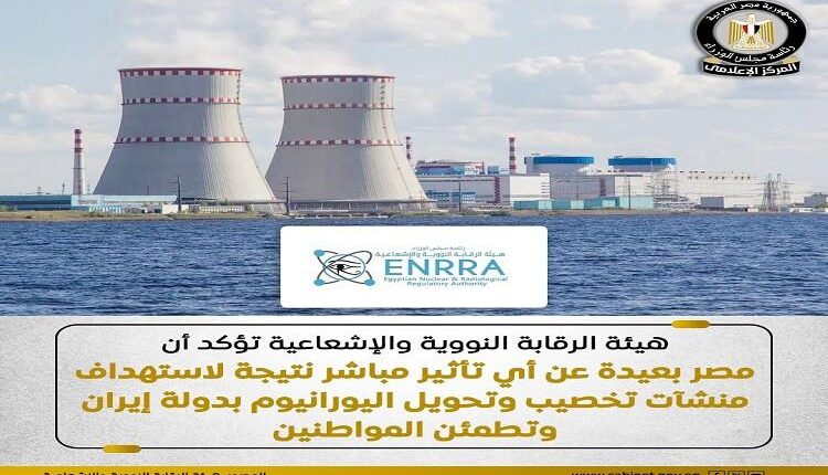 أكدت هيئة الرقابة النووية والإشعاعية أن جمهورية مصر العربية بعيدة عن أي تأثير مباشر نتيجة استهداف لمنشآت تخصيب وتحويل اليورانيوم بدولة إيران، اليوم الأحد، وتطمئن المواطنين بأنه لم يتم الإبلاغ من أي من الدول المجاورة لإيران عن رصد أي تغيير أو ارتفاع في مستويات الإشعاع لديها.