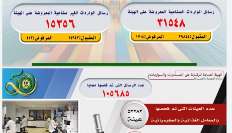 الرقابة على الصادرات والواردات :فحص 105 ألف و685 عينة غذائية وكيمائية وصناعية خلال النصف الأول من العام الجاري