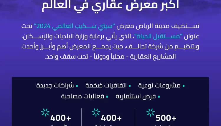 تنطلق خلال الفترة من 11 إلى 14 نوفمبر الجاري فعاليات النسخة الثانية لمعرض “سيتي سكيب العالمي 2024″، الذي يأتي تحت شعار “مستقبل الحياة”، وذلك في مركز الرياض للمعارض والمؤتمرات بملهم شمال مدينة الرياض برعاية وزارة البلديات والإسكان، وبالشراكة مع الهيئة العامة للعقار، وبرنامج الإسكان – أحد برامج رؤية 2030 -، وبتنظيم من شركة تحالف، المشروع المشترك بين الاتحاد السعودي للأمن السيبراني والبرمجة والدرونز، وشركة إنفورما العالمية، وصندوق الفعاليات الاستثماري.