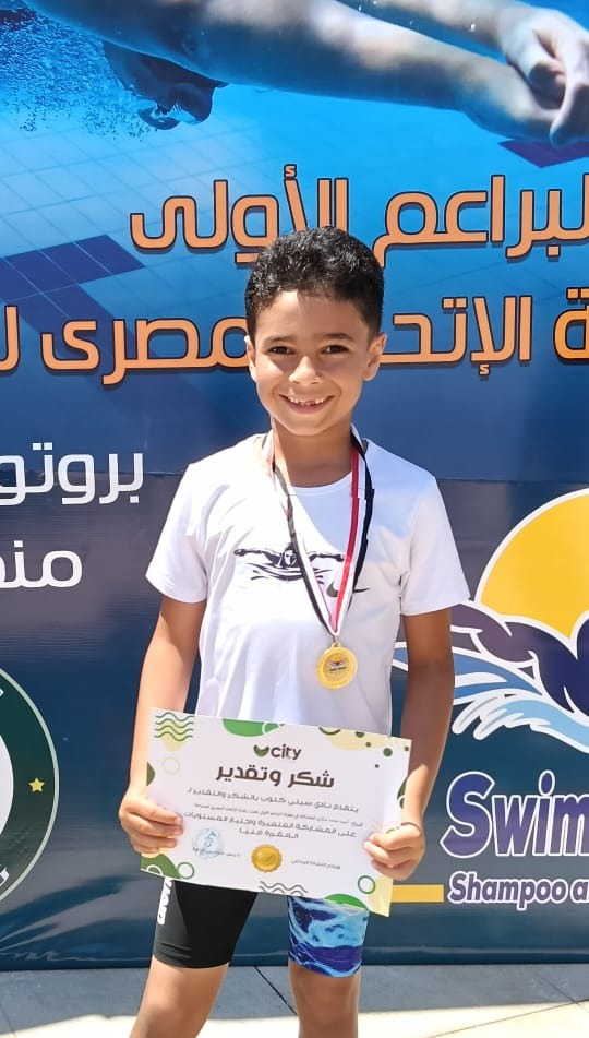 السباح احمد محمد شكرى الجمل ابن مركز بسيون ينضم للاتحاد المصري للسباحة ويحصل على النجمة الرابعة كأصغر سباح