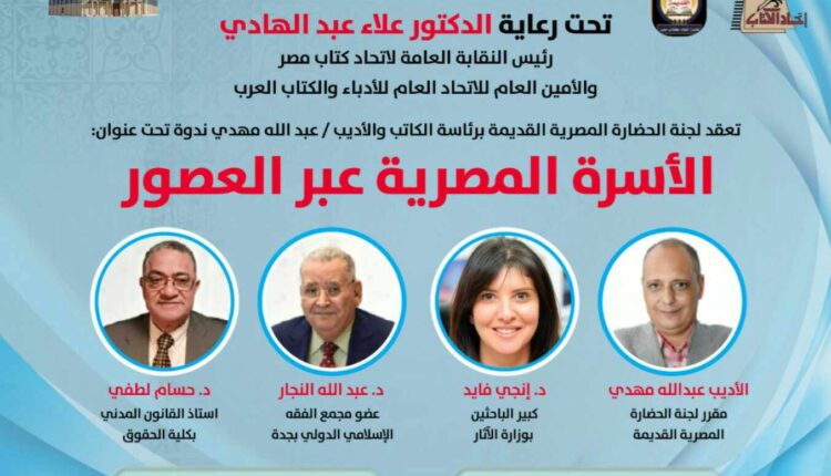 تنظم لجنة الحضارة المصرية القديمة بالنقابة العامة لاتحاد كتاب مصر، ندوتها الشهرية بعنوان «الأسرة المصرية عبر العصور»، يوم السبت ١٤ يونيو ٣٠٢٥ م، الساعة السادسة مساء، بمقر النقابة العامة لاتحاد كتاب مصر ١١ أ شارع حسن صبرى بالزمالك.