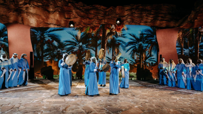 ليالي البلدة القديمة: حين ينطق التاريخ يتحول المدرج التاريخي كل مساء إلى لوحة فنية نابضة، حيث يطل عرض مسرحي ضخم يستحضر شخصية “الجدة حصة”. بأسلوبها الدافئ، تصحب الجدة أحفادها والجمهور في رحلة عبر الزمن، تروي فصولاً من حياة الواحة، طقوس الحصاد، وأفراح البلدة، وصولاً إلى الدور المحوري لساعة “الطنطورة” الشمسية. يدمج العرض بين الأداء التمثيلي المباشر والتقنيات الضوئية المتطورة، ليكون جسراً يربط ذاكرة الماضي بتطلعات المستقبل.