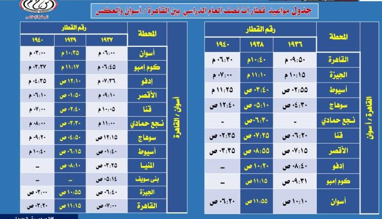 كما يتم تشغيل قطار 1937 ( مكيف ) أسوان / القاهرة ،اعتبارا من يوم 25/1/2024 بحيث يقوم من أسوان الساعة 06:00 مساءا ويصل القاهرة 07:00 صباحا، وقطار 1939 ( ثالثة مكيفة ) أسوان / القاهرة يقوم من أسوان الساعة 10:35 مساء ويصل القاهرة الساعة 11:15 صباحاً ، وقطار 1941 ( ثالثة مكيفة ) أسوان / القاهرة يقوم من أسوان الساعة 03:00 مساء ويصل القاهرة الساعة 03:20 صباحا طبقاً للجداول المرفق .