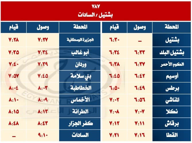 حيث تقرر تشغيل قطار 708 / 709 إيتاى البارود / السادات (تحيا مصر) يقوم من محطة إيتاى البارود الساعة 05:45 ويصل محطة السادات الساعة 07:50 طبقاً للجدول المرفق، وكذلك تشغيل قطار 699 / 700 السادات / إيتاى البارود (تحيا مصر) يقوم من محطة السادات الساعة 16:50 ويصل محطة إيتاى البارود الساعة 18:55 طبقاً للجدول المرفق، ويترتب على ما سبق تعديل جدول مسير قطار 787 بشتيل / السادات يقوم من محطة بشتيل الساعة 06:30 ويصل محطة السادات الساعة 09:10 طبقاً للجدول المرفق، مع استمرار جدول مسير قطار 788 السادات / بشتيل كجدوله الحالى.