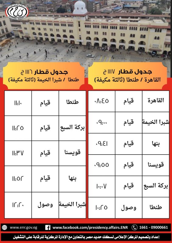 • قطار 1117 (ثالثة مكيفة): ينطلق من محطة القاهرة في تمام الساعة 8:45 صباحاً، ليصل محطة طنطا الساعة 10:25 صباحاً.